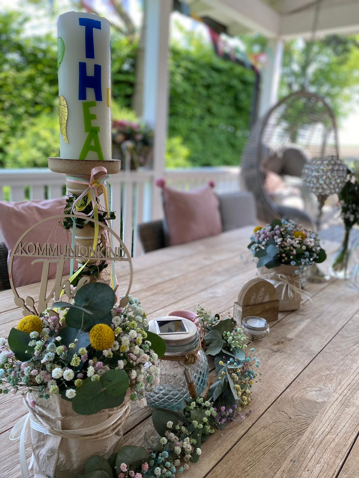 Die Palette der Floristik umfasst verschiedene Elemente wie, Tischdekoration, Kirchenschmuck, Kerzenschmuck, Haarschmuck, florale Armbänder und evtl. Anstecker für die Jungs-/ Teens-/ Herren.